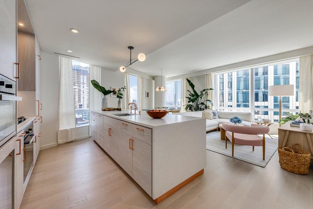 A welcoming foyer adorned with a coat closet and full bathroom flows into a spacious open-concept living room, dining room, and kitchen saturated with natural light. The kitchen is equipped with an eat-in island, sleek white quartz countertops, custom oak millwork, a built-in Sub-Zero wine refrigerator, and a fully-integrated appliances from Miele including a 4-burner has range, 30 refrigerator, oven, and speed oven.