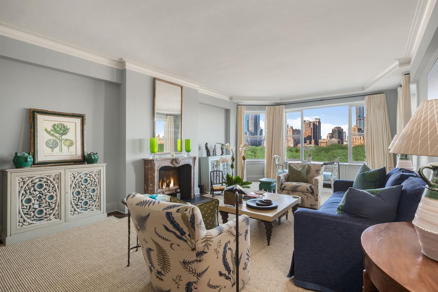 The expansive 25-foot living room enjoys three exposures, an original wood-burning fireplace, and breathtaking views of Central Park, Billionaire's Row, and the iconic skyline.