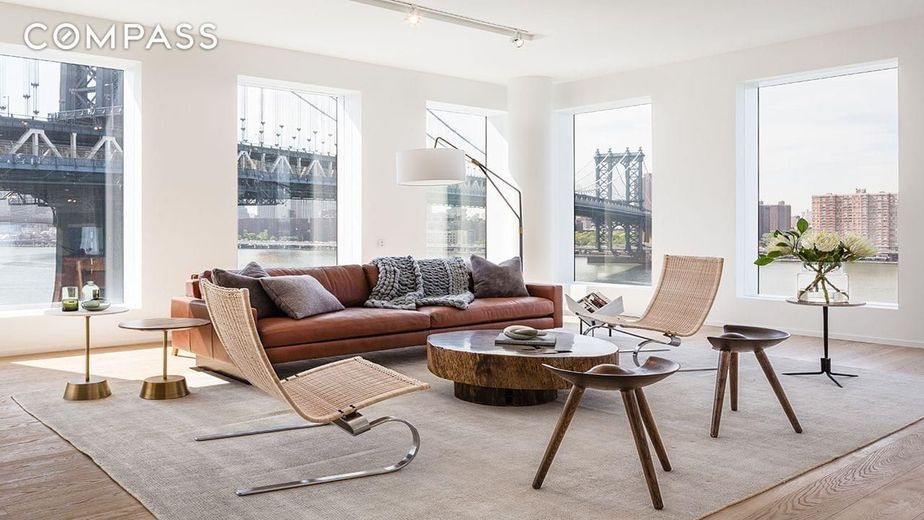 Stepping into the home, you're immediately drawn to the floor-to-ceiling windows that frame breathtaking panoramas of the East River and Manhattan skyline. Arguably boasting the best sight line in the whole building, this apartment sits just above the trees and has views of the entire Brooklyn and Manhattan Bridge spans as well as famous landmarks such as City Hall, the Empire State Building, and 1 WTC.