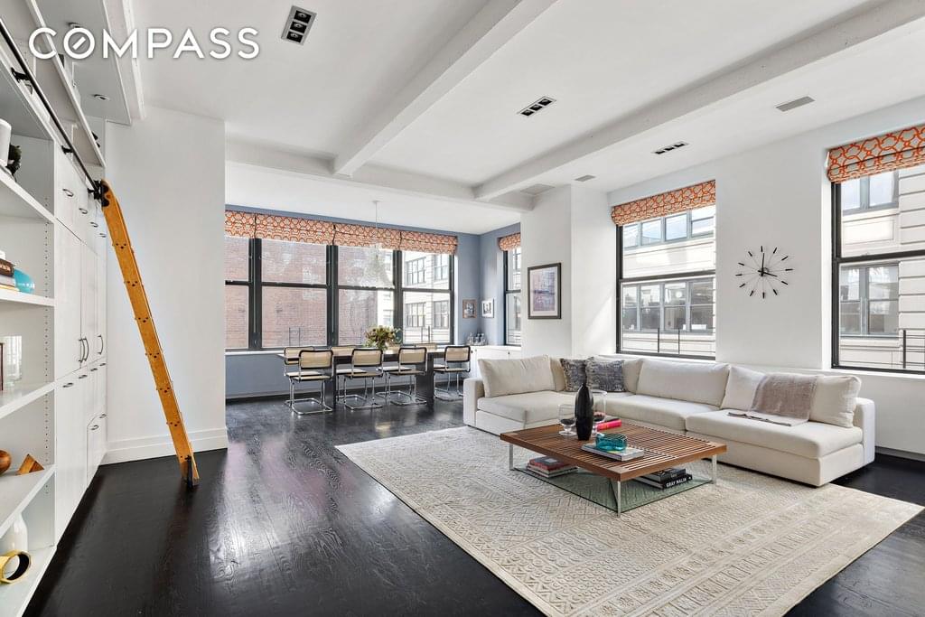 A flowing floor plan between the kitchen, living room, and dining room allows for plentiful light and air from the eleven windows framing the space. Anchored by a wall of custom built-in storage with a sliding ladder for both style and functionality, the inviting living room is an entertainer's dream.