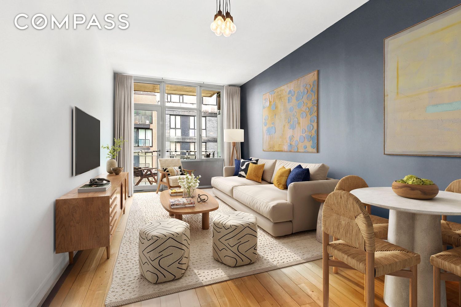Enter into a generously sized living room that easily accommodates a full-sized sofa, dining table, and more. A private balcony just off the living area provides the perfect spot for morning coffee or even your own herb garden. The open kitchen boasts high-end Bosch and LG appliances including a dishwasher, Caesarstone countertops, a large window for natural light, and a breakfast bar with additional seatingideal for entertaining or casual meals.