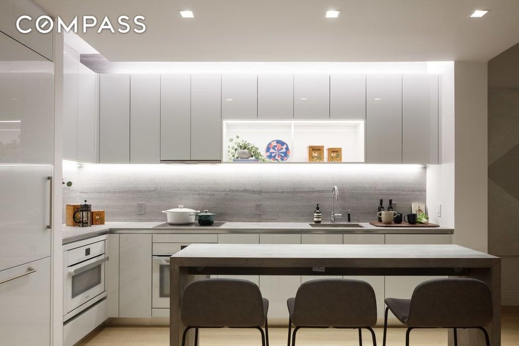 Kitchens designed by Harry Macklowe himself provide seamless technology coupled with classic elegance. Oceanwood marble slabs rest on custom Aran Cucine cabinetry, accented by white glass panels and satin nickel finishes. No expense was spared when outfitting One Wall's kitchens: from the best in class Meile appliances to the externally-venting exhaust to the insinkerator garbage disposal, these chef-styled kitchens are the perfect blend of beauty and function. Warm stone primary bathrooms feature large walk-in showers with thermostatic controls. Mirrored medicine cabinets are integrated with LED lighting with Silver Romano Travertine honed floors.