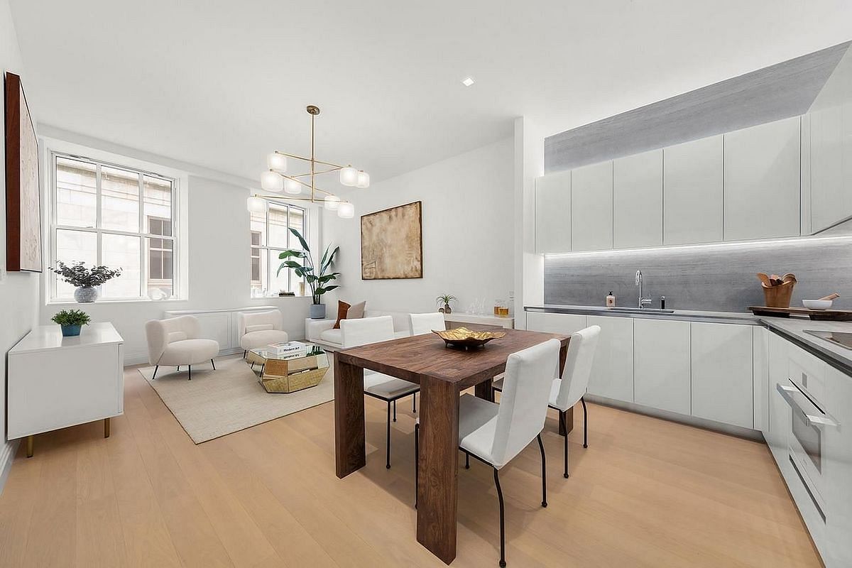 Warm stone primary bathrooms feature a stall shower with thermostatic controls. Mirrored medicine cabinets are integrated with LED lighting and Bianco Dolomite marble surround. The buildings one-of-a-kind residences maintain the integrity and character of the 1930s scale, a modern take to art deco detailing, and boast ceiling heights over ten feet throughout with wide-plank French Oak hardwood floors underfoot.