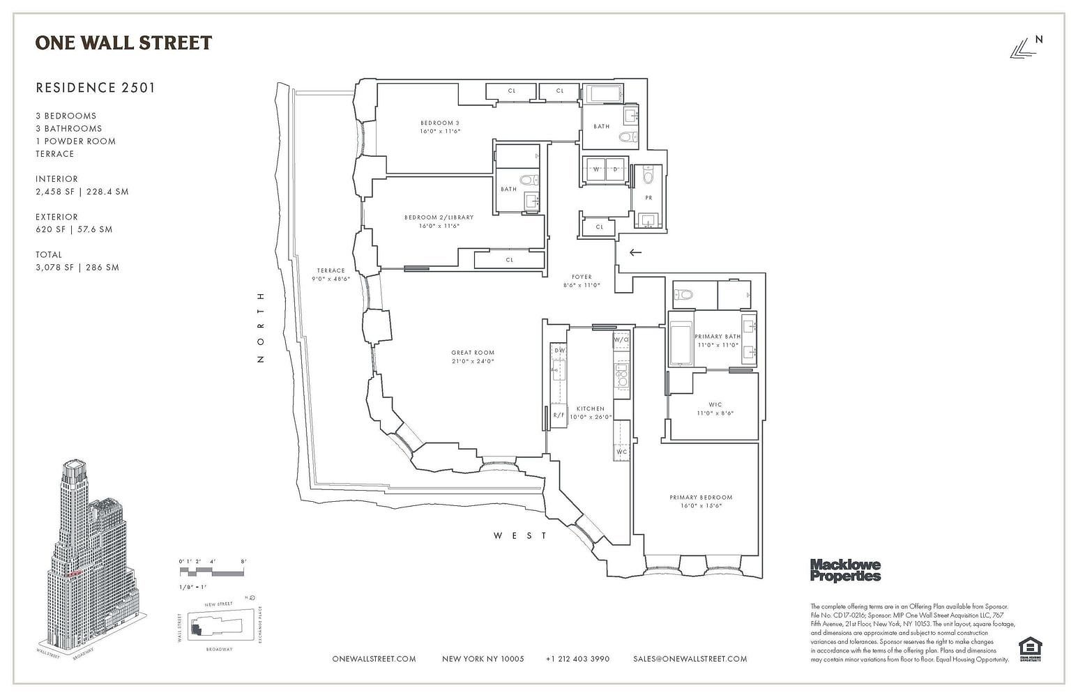 Move In Ready! Residence 2501 is a unique corner three bedroom, three-and-a-half bathroom home, with a sprawling 620 SF terrace. Located in the Northwest corner of the building, this home has exceptional natural light, an open chefs kitchen, and ample closet space. It is one of only three similarly styled lay outs in One Wall Street. Custom kitchens and baths pair seamless technology with classic elegance. From Kitchens featuring Aran Cucine cabinetry, best in class Meile appliances and insinkerator garbage disposal, the chef-style kitchen is the perfect blend of beauty and function.