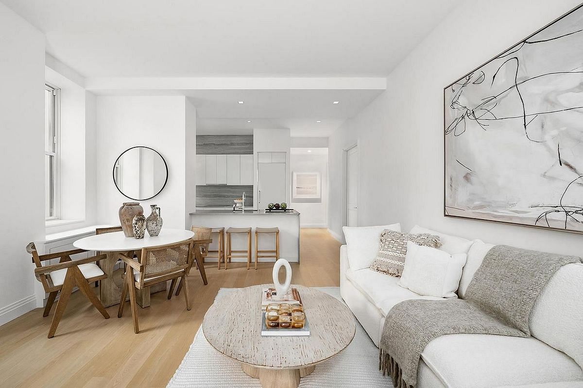 Warm stone primary bathrooms feature large soaking tubs with thermostatic controls. Mirrored medicine cabinets are integrated with LED lighting and Bianco Dolomite marble surround. The buildings one-of-a-kind residences maintain the integrity and character of the 1930s scale, a modern take to art deco detailing, and boast ceiling heights over ten feet throughout with wide-plank French Oak hardwood floors underfoot.