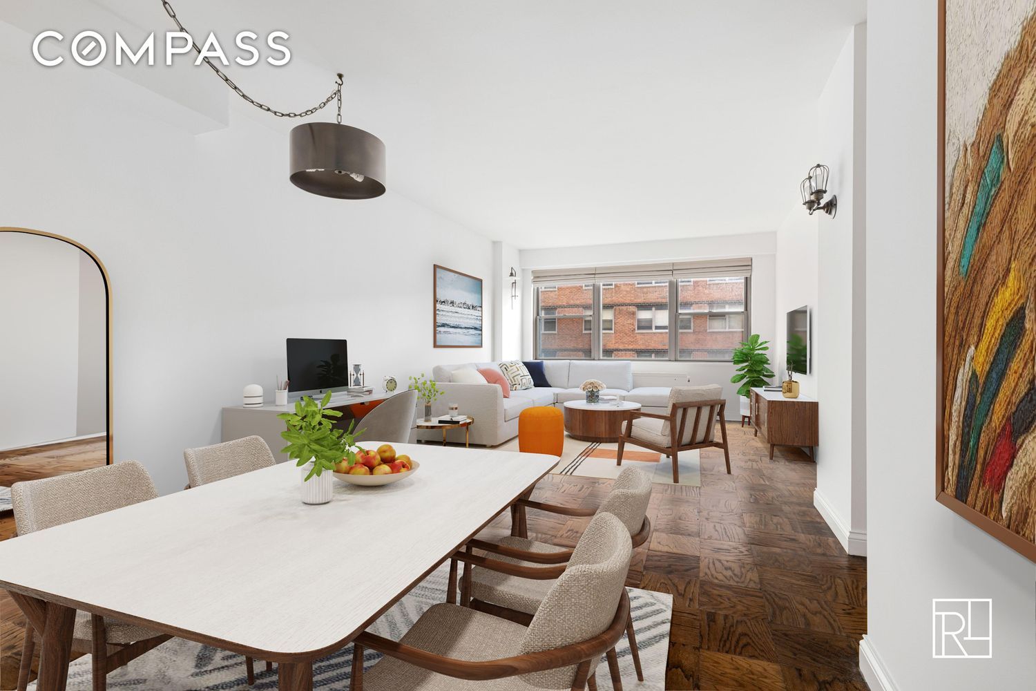 The open layout offers distinct living, dining, and work-from-home areas, complemented by deep walnut wood flooring and modern window treatments. Wall-to-wall south-facing windows fill the space with soft, natural light, creating an inviting ambiance.