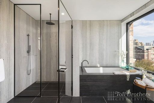 The separate bedroom wing provides privacy and tranquility. The king-sized primary suite features an enormous walk-in closet, and a spa-like en-suite bath clad in veined grey and black marble, with dual sinks, radiant heated floors, and both a deep soaking tub and a glass-enclosed steam shower. Southern light floods the oversized second bedroom, which also includes a luxurious en-suite bath. A powder room for guests and in-unit washer/dryer complete the layout.