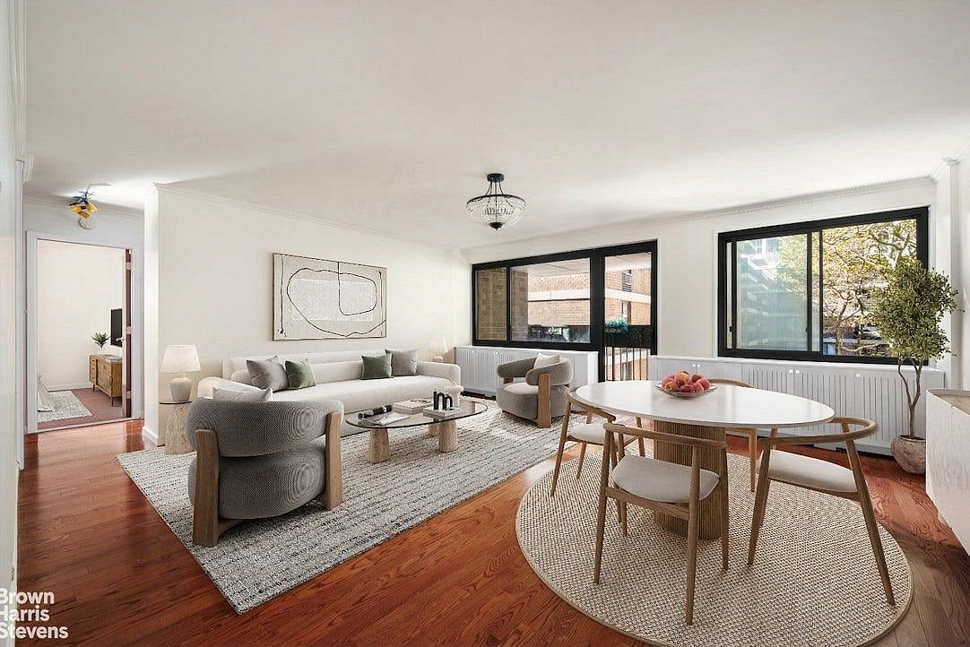 You'll be drawn to the stunning great room by two-extra wide windows flooding the space with western light and treetop views. Here, you'll find plenty of space for comfortable living and dining areas it's currently set up with two full sofas and a six-seat dining table with room to spare while the delightful 75-square-foot balcony is paved with gorgeous custom wood flooring. Overlooking a beautiful park with lush trees and plants, it's simply the perfect spot for morning coffee or an evening cocktail. This home has one of the quietest and most desirable views in Southbridge Towers.