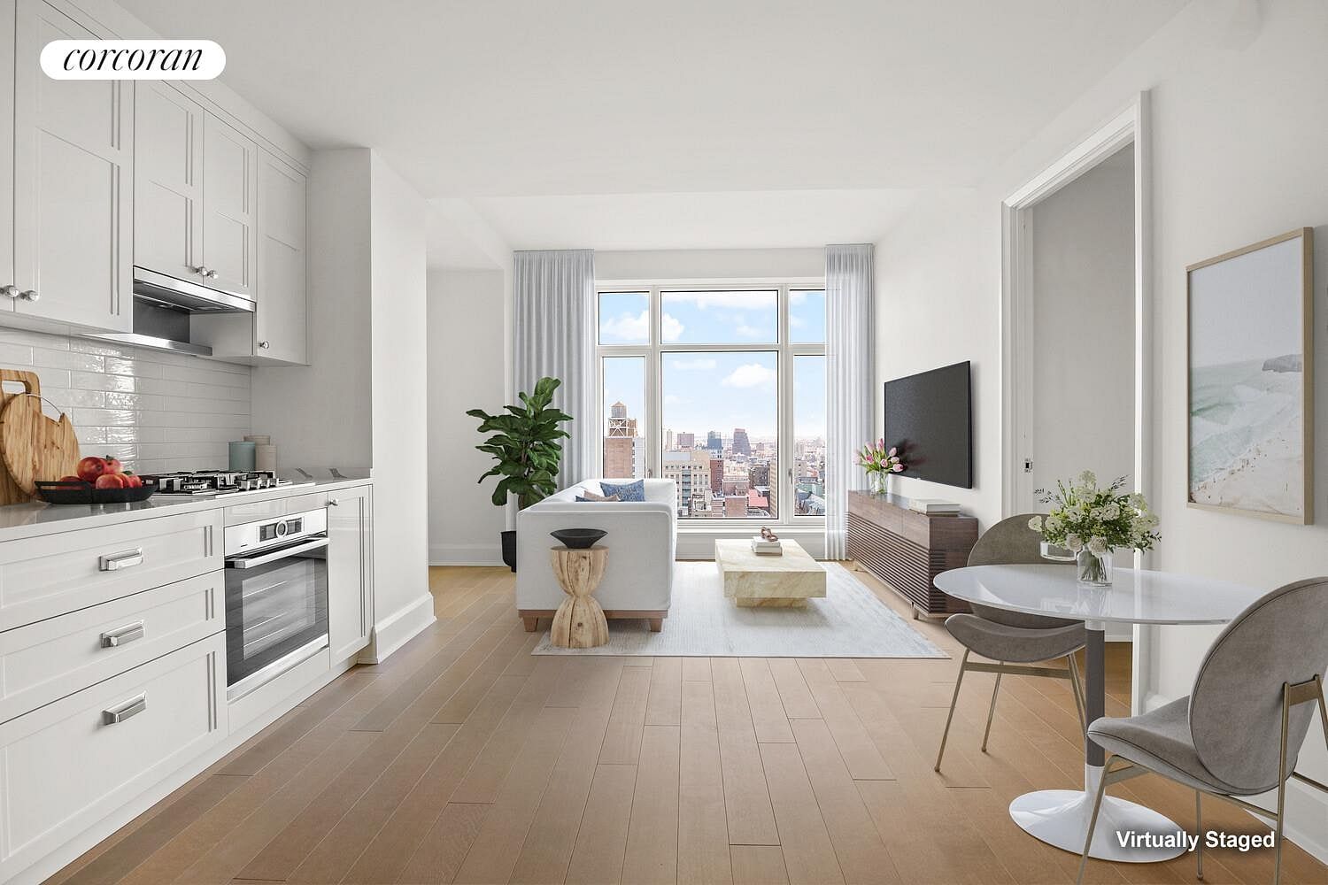 The interior is a masterpiece by Robert A.M. Stern Architects, featuring European white oak flooring and expansive windows that flood the space with natural light. The open concept living and dining area seamlessly connect to a stylish kitchen.
