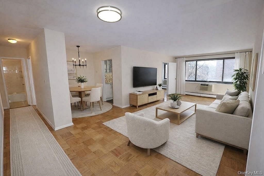 If there were ever a home that lives like a three-bedroom, this is it! Discover your own peaceful sanctuary just moments from the vibrant heart of Hartsdale in this sprawling, sun-drenched 2-bedroom, 2-bath co-op with the rare luxury of indoor deeded parking. From the moment you enter, you're greeted by an expansive, light-filled living and dining area designed for both effortless entertaining and everyday comfort. The stunning, fully renovated walk-thru kitchen is a true showpiece, featuring gleaming quartz countertops, stainless steel appliances, and custom cabinetry that stretches to the ceiling—blending style with exceptional functionality. What truly sets this home apart is the incredible flexibility of space. Off the kitchen, a formal dining room on one side and a generous bonus area on the other offer endless possibilities—imagine a chic home office, cozy den, guest retreat, or inspiring creative studio. The thoughtfully designed split-bedroom layout ensures maximum privacy. Tucked away, the oversized corner primary bedroom and bath feel like a private escape, easily accommodating a king-sized bedroom set. A second spacious bedroom sits on the opposite wing, adjacent to a beautifully updated hall bath. Abundant storage is yours with eight large closets, while rich parquet floors add warmth and timeless appeal throughout. And the convenience of your own assigned indoor deeded parking space is simply unmatched. All of this in the heart of Hartsdale's charming village—enjoy boutique shopping, popular dining, a lively farmers market, and an easy Metro-North commute to Grand Central in under 40 minutes. This is more than a home—it's a lifestyle. The building offers 2 common laundry rooms, plus extra storage for an additional fee. Estimated monthly maintenance $1266, additional fees $243/month - No pets. Requirements 650 credit FICO score, 10% down, DTI under 28% (Bonus and overtime not included). 6 months of liquid assets of Maintenance and mortgage for last 6 months. The unit comes with 1 assigned indoor parking space # 113 for $72/mo.; space is deeded so must pay for the spot. Maintenance prior to STAR credit.