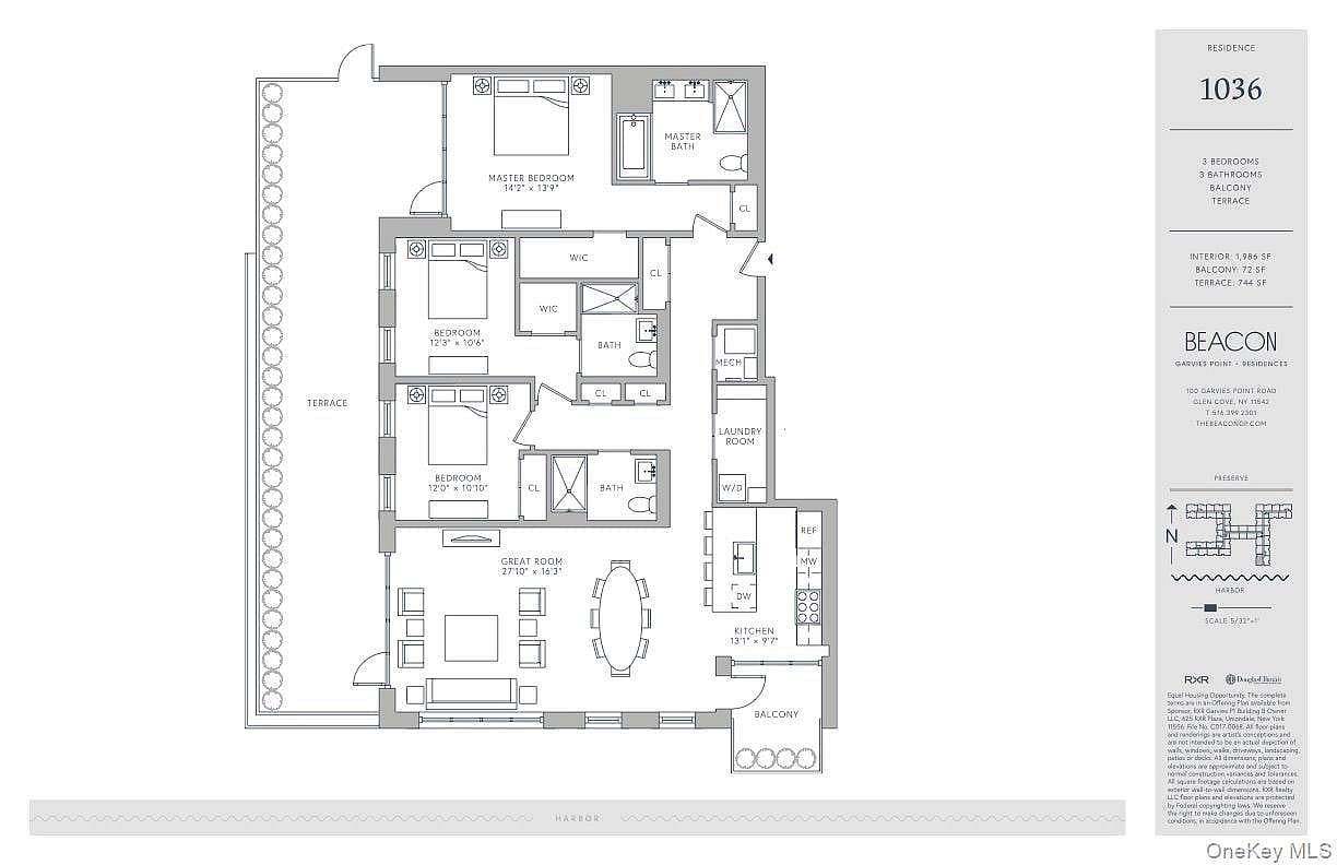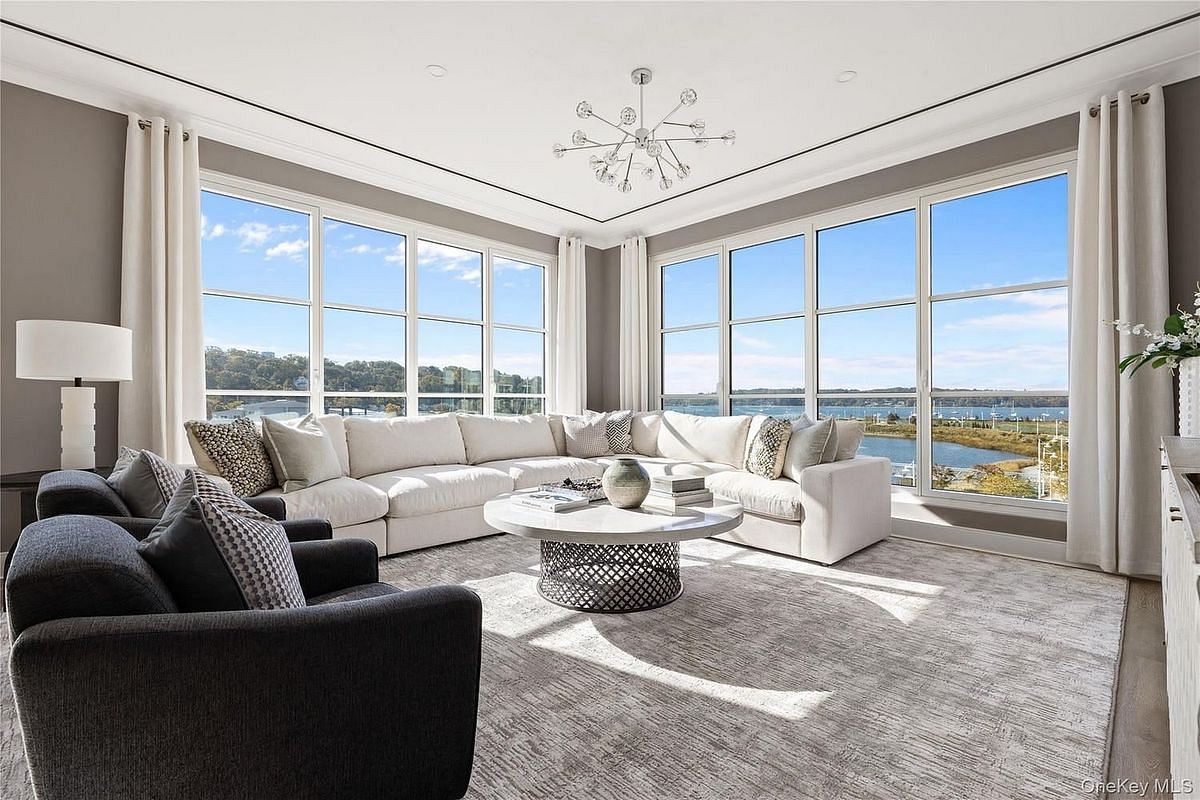 GLEN COVE. Luxury living at its finest, within the Beacon at Garvies Point; nestled on 56 acres of waterfront, residence 1036, is an exquisite 3 bedroom, 3 full bathroom home. The 12' ceilings and floor to ceiling windows with western and southern exposure, offering all day sun and views of the pool and marina. The open gourmet kitchen has white Brazilian quartzite countertops and a kitchen island with a Kohler under-mount sink, Sharp easy touch drawer style microwave and Insinkerator garbage disposal. A GE Monogram 6 burner gas range is equipped with dual infrared cooking and is fully vented. The spacious primary king-sized bedroom features an oversized closet and an en-suite 5-fixture master bathroom with white marble floors, countertops and full height porcelain tiled walls, a soaking tub and glass enclosed shower and a double vanity with all Kohler fixtures. This home is an entertainer's dream with a private patio as well as all the amenities and comfort the Beacon has to offer; paths, courts, marinas, beaches, dog parks, and much more!