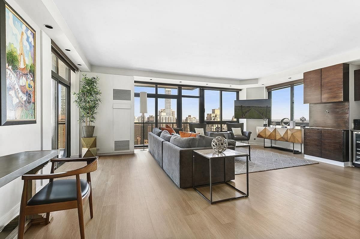 With approximately 1,242 square feet of interior space and a 105-square-foot balcony, this bright, north-facing residence features a spacious living and dining area with floor-to-ceiling windows and plenty of room to entertain. The open kitchen is equipped with custom wood cabinetry, Caesarstone countertops, colorful tile accents, and high-end Bosch, LG, and Sub-Zero appliances, plus a breakfast bar for casual dining.