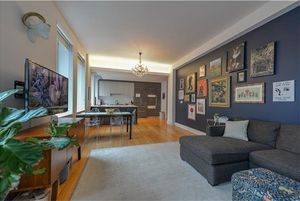 The large living/dining room sits on the corner with and western exposures and is great for entertaining, with ample space for a dining area and a media/sitting area with a custom built-in oak console. The open chef's kitchen features a large island, abundant cabinet and quartzite counterspace, top-shelf appliances (Liebherr and Miele, with the stove true-vented), and an owner-added wine fridge with above and below cabinetry.