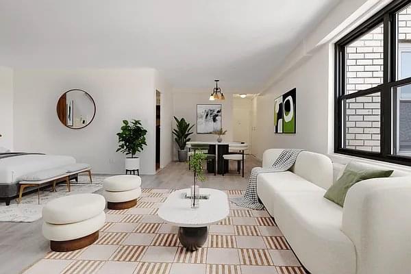 High floor drama with amazing north light, this extra-large alcove studio checks all the boxes!Enter into the foyer, which boast a huge coat closet, and continue into the enormous dining area. Marvel at the sparkling beautiful floors and the renovated kitchen with smooth white cabinets, luxurious countertops, and brand-new appliances. Then, walk through the expansive living room flooded with light from the wall of north-facing windows. The sleeping alcove has plenty of space for a king-size bed and more plus there are two additional closets on the way to the impeccably-renovated bathroom-and one is a walk-in!And the best part of all is that this is a sponsor unit with NO BOARD APPROVAL. Pieds a terre, co-purchase, and pets under 25 pounds are all welcome here!Best of all you will be living in one of the crown jewels of The Bronx: the famed Executive Towers-the most luxurious building ever constructed on the Grand Concourse.Designed by the master architect Philip Birnbaum and completed in 1963, 1020 Grand Concourse occupies the prominent corner of 165th Street directly across from the Bronx Museum of Art and conveniently located near the B, D and 4 trains, multiple bus lines, and convenient shopping and services. Four parks nearby offer amazing recreational opportunities and the feeling of living in a meticulously planned neighborhood that brings you the best of the city and the outdoors-and yet is only 20 minutes from Midtown Manhattan!Enjoy full-service living with nothing overlooked. From the integrated central air conditioning and heating system to the 24-hour building staff, you'll be taken care of impeccably! Plus the low, low maintenance includes gas and electricity. Furniture has been virtually added to the photos.Features:24-hour doorman and securityOn-site attached garage with available assigned spaces for residents (at additional cost)24-hour laundry roomsLive-in superOn-site management officeBuildingLink system for communication and delivery notificationsBicycle storage roomRecently-completed exterior restoration projectRestored historic tile entrance canopyNew automatic entry doors and lightingProjects being planned:Lobby restoration to bring back the style as it was in 1963Addition of a garden on the garage rooftopCreation of a gym within the buildingShowing by appointment only - don't miss out on this incredible opportunity!