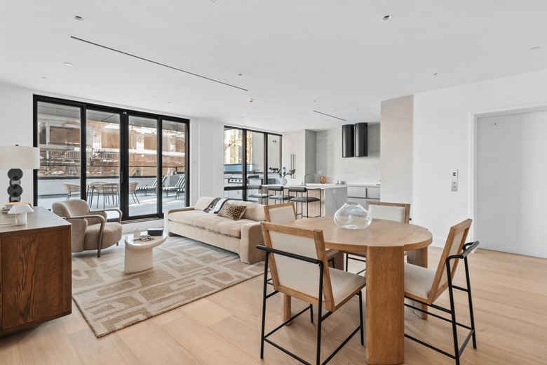 A private keyed elevator opens directly into a 1,700 SF floor-through interior bathed in natural light. The great rooms open plan integrates living, dining, and kitchen spaces, framed by floor-to-ceiling Pella windows and finished with 9.5 wide-plank white oak floors.