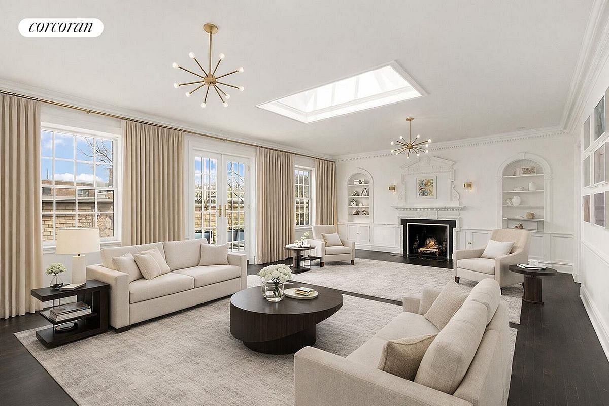A private elevator opens directly into a skylit foyer, where French doors lead effortlessly onto the terrace. The natural flow of the living spaces supports both comfortable everyday living and large-scale hosting. The sun-flooded living room, centered around a wood-burning fireplace, is both warm and expansive, with seamless access outdoors and a discreet wet bar with Sub-Zero wine storage. The formal dining room sits just beyond, connecting to a chef's kitchen with custom cabinetry, stone and marble surfaces, an oversized skylit island, and top-tier appliances including an 8-burner range and Sub-Zero refrigerator. An adjoining media room and separate service entrance add convenience and flexibility.
