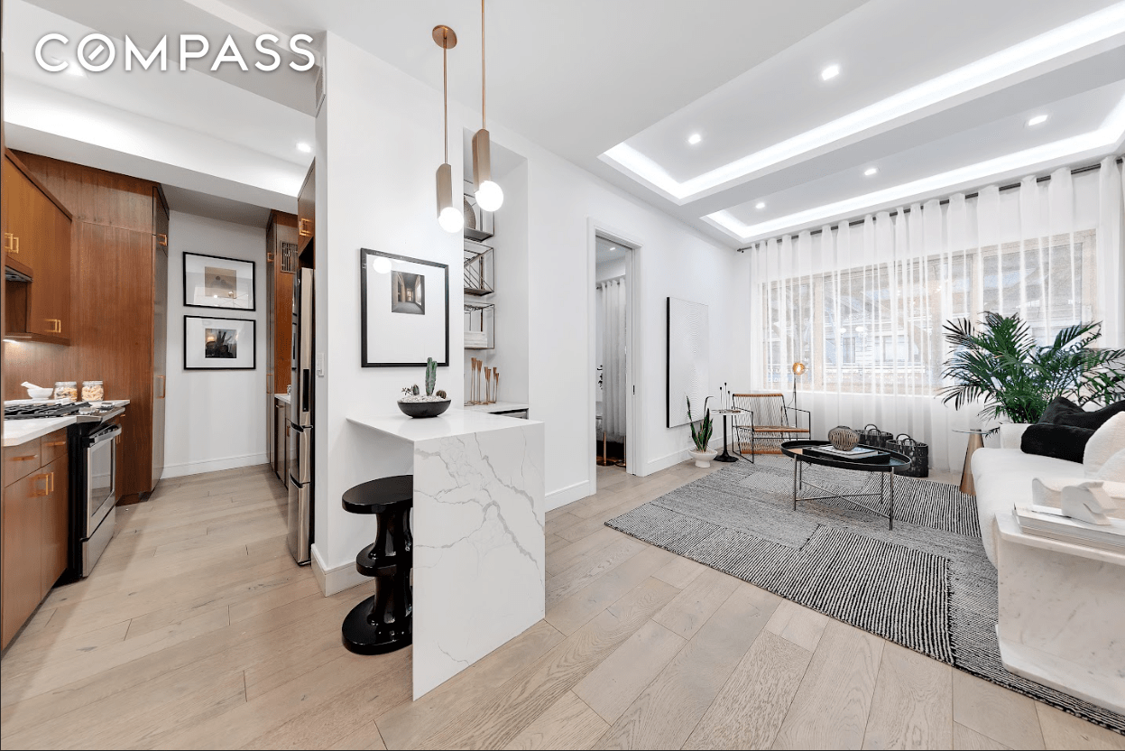 Upon entry, be captivated by soaring 12-foot Crawford ceilings and bespoke lighting that elevates the living space. The open-concept chefs kitchen is a true showstopper, featuring custom walnut cabinetry, Italian Calacatta Caesarstone countertops, a refined white marble backsplash, and top-tier stainless steel appliances. The spacious primary and secondary bedrooms have ample closet space and custom storage. Each spa-inspired bathroom boasts sleek black hardware, luxurious rain showers, and modern fixtures, exuding sophistication at every turn.