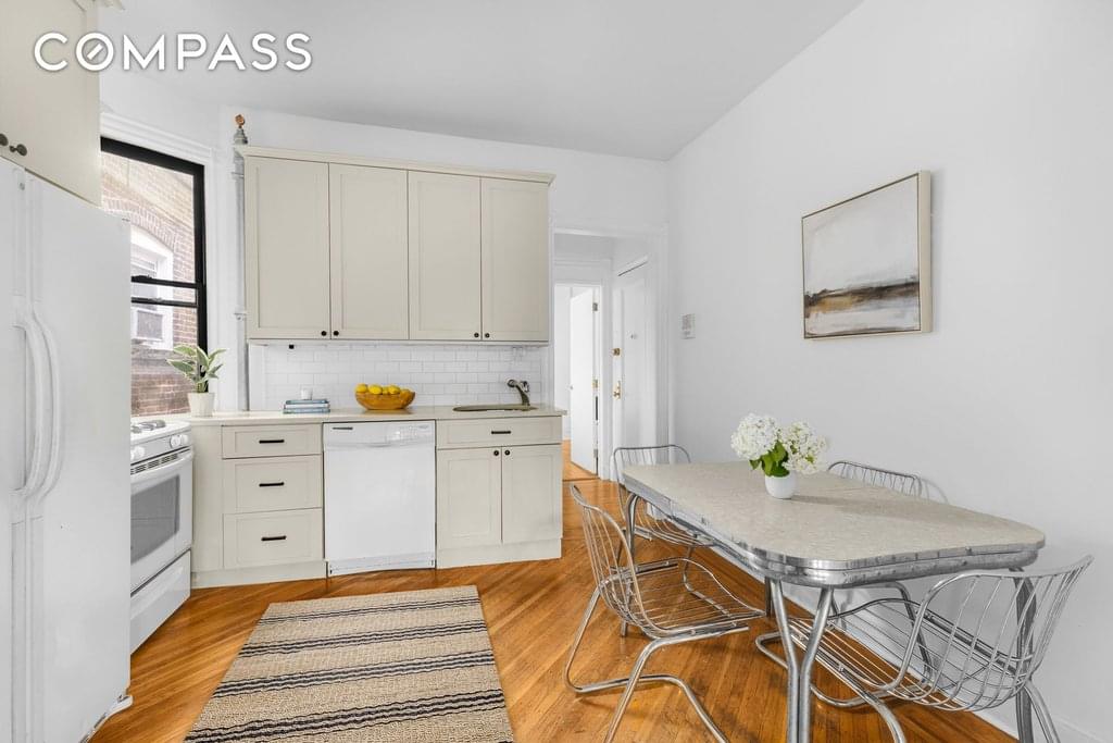 Perched on the top floor of an 8-unit co-op building in prime Park Slope, this southern-facing and sun-drenched 2BR/1BA awaits. Upon entering, you'll be greeted by a small foyer and an open, eat-in kitchen that's connected to a spacious living room with high ceilings, a WORKING FIREPLACE with exposed brick and a unique set of four curving bay windows, that offer treetop views and birdwatching. The sizable kitchen easily accommodates a large dining table and has a dishwasher, window, abundant storage, and plenty of counter space with quartz countertops, real wood soft-close cabinets and a white subway tile backsplash. Off the living room, one bedroom -- that could also be used as an office, nursery or den -- has French doors that allow even more sun to stream in all day, and exposed brick as an accent. It's outfitted with a full wall of custom closets, complete with hanging space, shelving and drawers. A windowed bathroom and larger second bedroom with additional custom closets and room for a Queen bed are situated on the opposite end of the apartment, for increased privacy and quiet. The bedrooms feature ceiling fans and the living room has a gorgeous period chandelier -- all the historic charm of the brownstone block, come to light. The building also includes a lovely, professionally landscaped shared garden, with flowering rose vines and vibrant rhododendron.