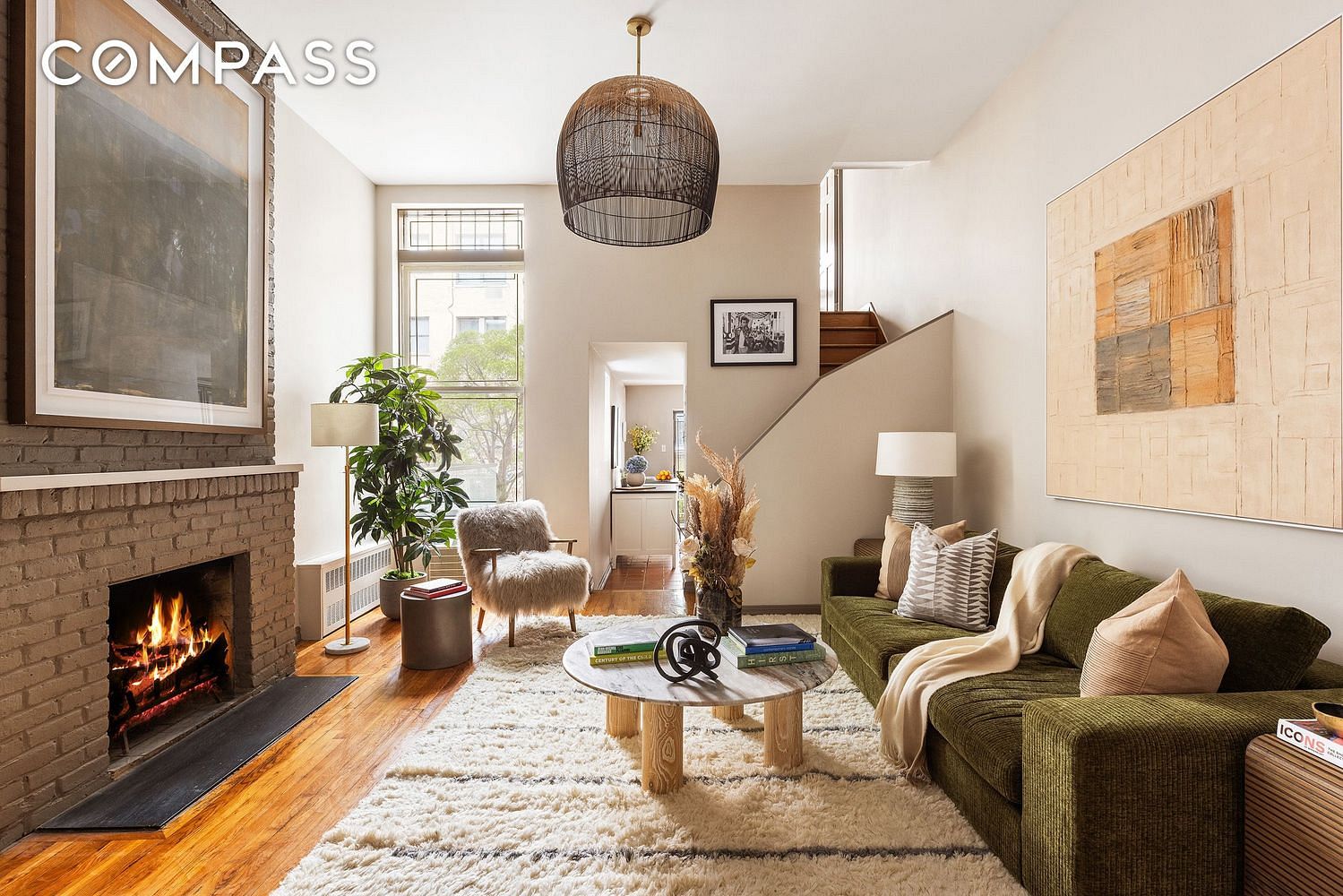 Up one exterior stair to the building landing the apartment is directly off the entrance. Upon entry, the unique layout and historic charm of the home carefully reveals itself. Just off the entry hallway at the front of the home is a large and sunny bedroom with soaring ceiling heights and southern exposure windows - this room can accommodate a king-sized bed and also has a large closet. Passing back through the entry hall toward the back of the home, there are two large closets as well as a full bathroom. The magic truly happens as you enter in the tremendous open living room with over 11ft ceiling height, exposed brick, and a double height window overlooking the rear townhouse gardens. A versatile and inviting space, the living room can accommodate a dining area and is great for entertaining or offering laid back relaxation and cozy living in front of the wood-burning fireplace. A bonus feature, there is an additional 150sf of lofted storage space that can easily be converted to a low height reading nook or childrens hangout. To the rear of the home, the layout duplexes with a second bedroom over a large kitchen. Both spaces have two exposures with western windows and double doors each opening onto two north-facing private balconies. The large eat-in kitchen, with stainless steel gas stove and dishwasher, has abundant storage and plentiful cooking space with over 16ft linear run of cabinetry and counter. And, of course, the private balcony begs for an outdoor grill - perfect for summer time cooking or indoor/outdoor living. The upper secondary bedroom, up one short flight of stairs from the living room, has an exterior closet and en-suite bathroom. The large north-facing balcony easily accommodates a sitting area and looks over charming townhouse gardens below. The home features hardwood floors throughout, through-wall air conditioning, and a brand new in-unit Miele washer/dryer.