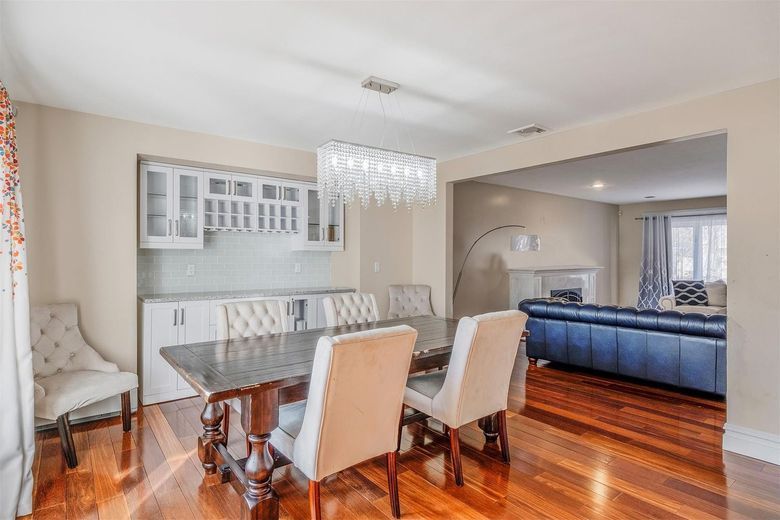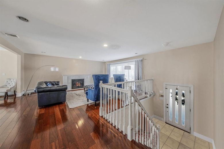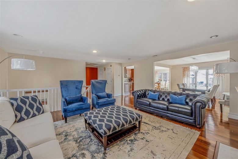 Fordham- a classic split-level colonial home is nestled on a quiet, tree-lined lane. This home boasts an awe-inspiring square footage with massive living areas and roomy bedrooms. The expansive upper floor hosts a formal living room, outfitted with floor-to-ceiling windows and a custom-built fireplace, a formal dining room equipped with a custom built-in bar sporting white shaker cabinets and quartz- perfect for entertaining as well as maximizing your kitchen space. The stunning, sunlight-drenched eat-in kitchen styles a classic, elegant, deep mahogany wood and Tuscan granite look with custom cabinetry extending to the ceiling and a built-in pantry for a tall and modern feel. Brand-new stainless-steel appliances include a double-door fridge with water filter, chef's choice stove and vent, a built-in pot filler for your convenience, a modern farmhouse sink, and an additional sink. Directly off the kitchen, a glass sliding door opens to the deck, outdoor seating, and grilling area- once again, perfect for the family and entertaining. The upper floor continues with three large bedrooms- and 3 full baths, all renovated and outfitted with custom pieces. The expansive primary suite has an oversized closet as well as a stunning en-suite bath- again outfitted with custom cabinetry, huge walk-in shower with an additional rainfall feature, the design really showcases the gorgeous porcelain white, sapphire blue, and matte gold finishes.