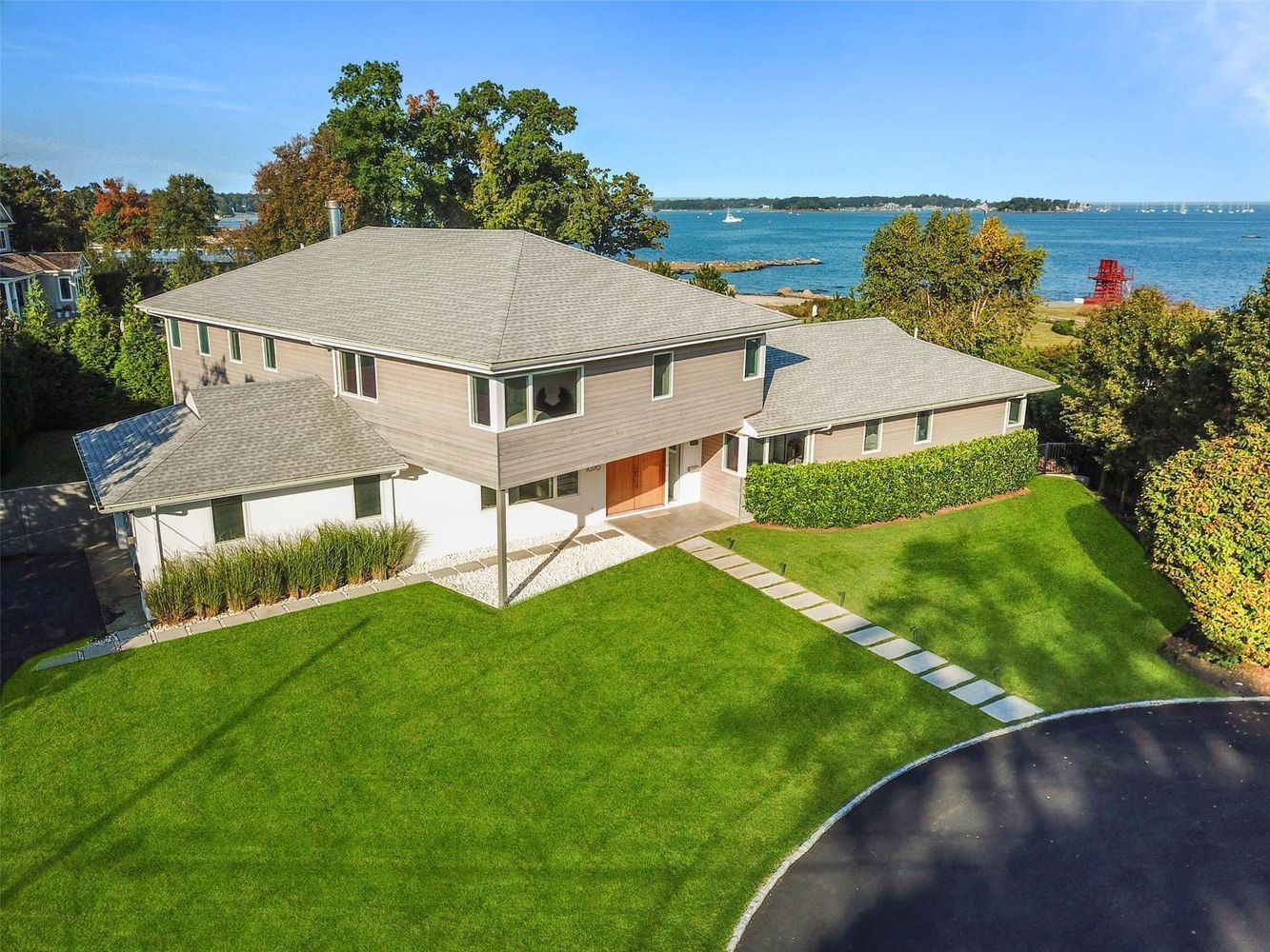A California-cool designer home, fresh from a stunning 2019 renovation with panoramic views of Long Island Sound, salt water pool and private beach access. This modern architectural beauty is set at the end of an exclusive 12-home cul-de-sac in the hip coastal enclave of Orienta. Sleek and effortlessly elegant, it boasts an organic 5,638 sqft floor plan with light and water views at every turn. Inside is tranquil and crisp-white with soaring ceilings and walls of glass that blend indoor living with the outdoors. Every space embodies a refined simplicity, from the 2-story entry to the streamlined kitchen with top-tier appliances, to the stylish dining and living rooms with water-views and sliders to the coastal-chic patio and pool. This home’s 6 beds are all ensuite with walk-in closets – 3 on the 1st floor laid out around a dreamy family room. On the 2nd floor, the spectacular primary with water-views and private balcony, 5th bed and an office. The above ground lower-level features a poolside rec room, outdoor shower, nanny suite and changing area. Plus, a fabulous mudroom and 2-car attached garage!