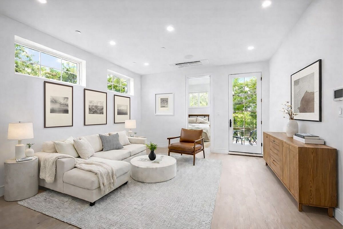 On the main level, a sun-filled open-plan living and dining extends naturally to a south- and east-facing balcony, creating a bright and inviting setting for everyday living and entertaining. The kitchen is thoughtfully designed with clean finishes, a Bertazzoni gas range, a built-in wine fridge, and a center island with seating for four, along with generous storage and full-size appliances. White oak flooring throughout the residence adds warmth and continuity.