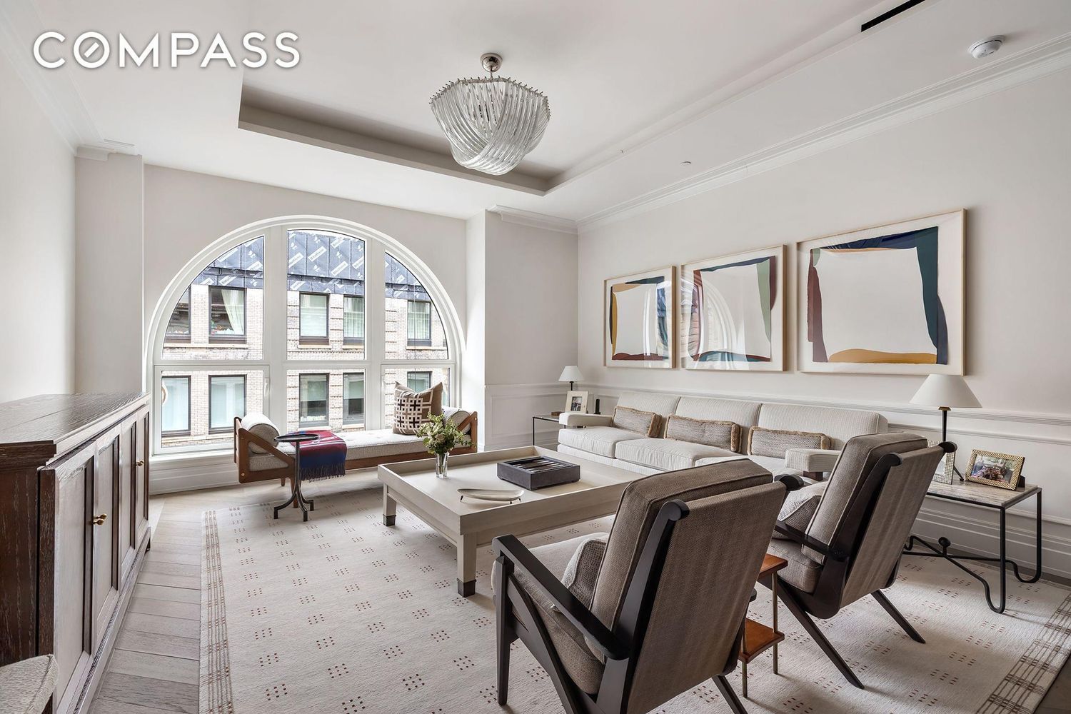 Located in the luxurious architectural masterpiece that is 108 Leonard Street, where Parisian opulence seamlessly pairs with contemporary design and modern convenience, this exceptional 1,927 three-bedroom/three-and-one-half bathroom home achieves an unprecedented level of quality and refinement. Upon arrival, a spacious foyer and gallery open to an exceptional great room with dramatic Arched windows, expansive walls for art, and ceiling heights in excess of 10'. Gorgeous wide plank gray oak flooring arranged in a chevron pattern runs throughout entertaining and transitional spaces. Custom designed by Jeffrey Beers International exclusively for 108 Leonard, Scavolini kitchen cabinetry is featured in an open plan with a Calacatta Vagli marble countertop, backsplash, and waterfall island replete with supplemental storage and ideal for both every day and occasional entertaining. Generously proportioned, the kitchen is outfitted with premium Miele appliances including a 5 -burner gas cooktop with vented hood, combi steam/convection oven, electric speed oven and wine refrigerator. A distinct entry vestibule creates a sense of privacy and seclusion in a Master Suite with large windows, a walk-in closet and a luxurious en suite bathroom with high-honed Calacatta Mandria marble floors and walls. Fantini polished chrome fixtures compliment the custom vanity and an oversized walk-in shower. Two secondary bedrooms with en suite bath, a signature powder room with sculptural Nero Marquina marble sink and a utility closet with washer and dryer complete this singular offering. Available furnished or unfurnished, this home is resplendent with bespoke details lending both a unique style and luxurious design featuring Stark carpeting in the two guest bedrooms, blackout shades and drapes, California Closet build-outs in all seven closets, a custom built-in bar in the dining area, and stunning light fixtures throughout including Murano glass chandeliers in the living area. A deeded private storage locker is included as well. 108 Leonard offers multiple attended lobbies, a discreet drive in motor reception with private valet parking and over 20,000 square feet of wellness driven amenities built for entertaining, repose and revitalization including a fitness center, lap pool, chefs kitchen with dining room and wine vault, childrens playroom, lounge, and roof terrace with cabanas and yoga platform. Award-winning hospitality design firm Jeffrey Beers International has scrupulously restored renowned architect McKim Mead & Whites Italian Renaissance Revival landmark; masterfully imbuing a distinctly contemporary yet timeless point of view within Tribecas most iconic century-old building.