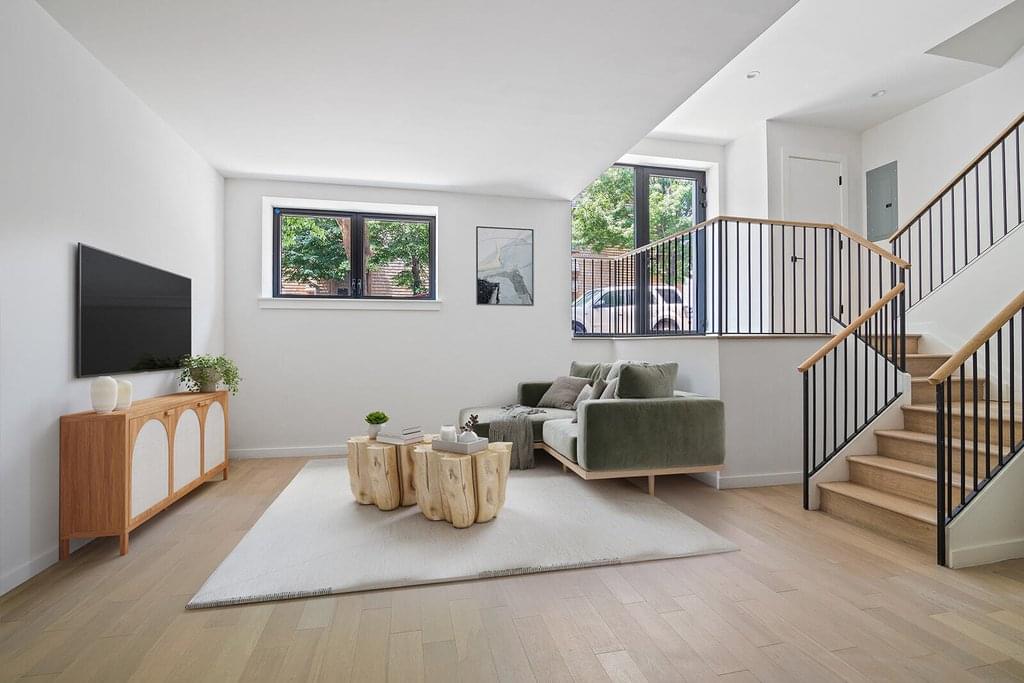 An open-concept living room, dining room, and kitchen on the lower level maximizes space and natural light. The kitchen is equipped with an eat-in Atlantic gray marble waterfall peninsula, Cambria countertops and backsplash, custom cabinets with matte black pulls, PABLO pendant lighting, Hansgrohe fixtures, and a suite of fully integrated Bosch appliances. A full bathroom and two storage closets complete the lower level.
