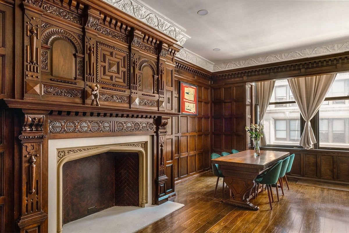 Step through a Gothic-inspired archway into the expansive great room, where soaring ceilings, ornate plaster moldings, and richly carved wood paneling frame a dramatic fireplace. Oversized north-facing windows invite abundant natural light, highlighting the striking architectural details and the wide-plank hardwood floors.