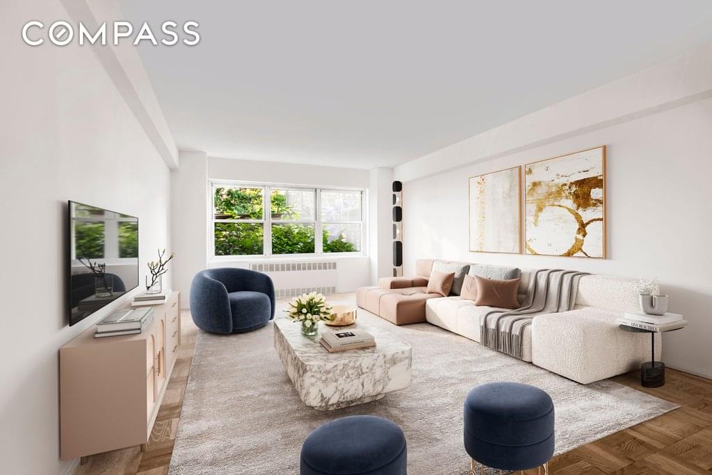The K-line is known for its loft-like living and dining area which stretches over 34 feet making it one of the most sought after 2-bedroom lines in the building. The large, windowed kitchen can easily be opened to include a breakfast bar and the building is one of the few in the area that permits washer/dryers. Enjoy townhouse-like quintessential village views on the 2nd floor with both the living room and primary bedroom overlooking the treetops of Fifth Avenue and the kitchen and 2nd bedroom overlooking the charming courtyard's fountain.