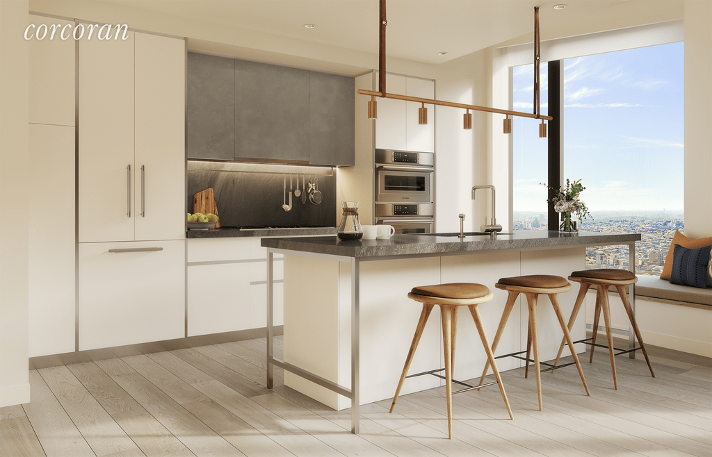 This one bedroom, one bathroom residences on the 26th floor features 10' lofty ceilings, open eastern views over Brooklyn. The open chef's Classic kitchen comes fully equipped with a premium Bosch appliance package which includes a refrigerator, dishwasher, vented stovetop exhaust fan and gas cooktop. This kitchen offers a bright, fresh, contemporary feel with pale white oak floors, Italian custom cabinets in white satin-lacquer with patinated zinc accents and honed Italian lava stone countertops and back splash enhancing the art and beauty of your culinary experience.