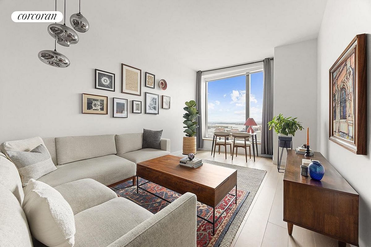 Residence 30B at 11 Hoyt is among the building's most sought-after one-bedroom layouts, offering an expansive floor plan and sweeping western views of the Manhattan skyline, the Statue of Liberty, and New York Harbor.