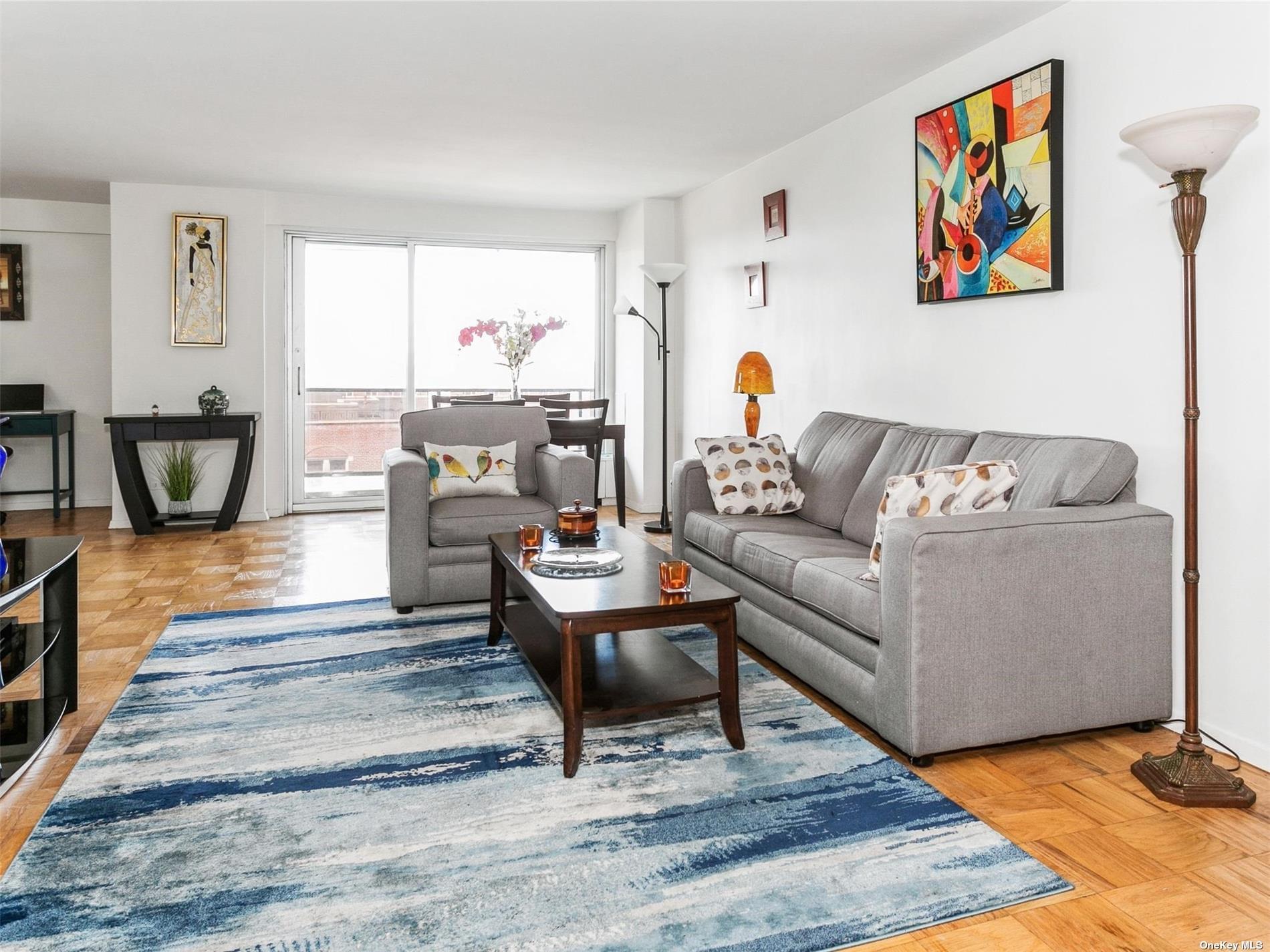 Savor morning coffee on your extra-long terrace in this large, turnkey, highly desirable Kennedy House Jr4 featuring recently-renovated kitchen and bathroom with hardwood parquet floors throughout and truly endless closets! Having a mere 30 square feet less than a Kennedy House 2 Bedroom, the "E" line is the largest Jr4, and is easily convertible to 2 bedrooms is desired. Create your favorite dishes in the large, walk-thru windowed coastal kitchen featuring soft-hued grey ceramic tile floor, white cabinetry with grey-veined white quartz countertops, marble backsplashes, and suite of top-level Samsung stainless-steel appliances. The bathroom has been fully renovated with all new tile floor, white subway tiles, fixtures, and glass doors. Large, bright bedroom has windows that look onto terrace, and 2 very large closets. Hallway leading to bathroom has closets on both sides. Central air & heat. Kennedy House Amenities abound: all utilities, taxes, and gym included in maintenance except cable/internet. 24 hour Doorman and Garage attendant, seasonal Rooftop pool (fee required), rooftop Skyroom for parties and gatherings, no wait-list parking in spotless heated garage ($200/month, park your own car) children's playroom, spacious & immaculate laundry room. Extra storage available for nominal fee. Outdoor Sitting area. Steps to fabulous Forest Hills dining and shopping, E,F,M, & R Subways, and Long Island RR. Minutes to Manhattan and both NY Airports. Zoned for PS 196. A great opportunity, don't miss this one!