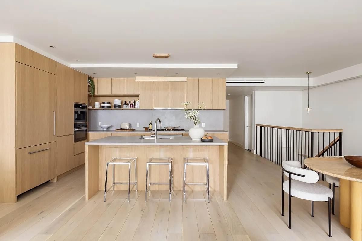 The thoughtfully selected finishes include oak wood floors, concrete like Caesarstone backsplash and countertops, custom Shinnoki wood cabinets, Miele appliances and European light fixtures by Astro. Bathrooms feature fixtures by Grohe and Duravit and tiles by Porcelanosa, imported from Spain.