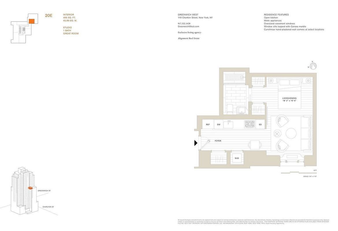 Residence 20E at Greenwich West, located at 110 Charlton Street, is a stylish studio apartment with one bathroom. Designed by famous Parisian architect Sbastien Segers, every detail of this home has been carefully created to be both beautiful and inspiring.