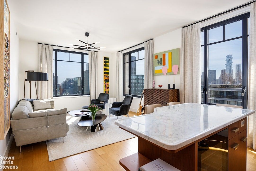 The living room has bright South and East exposures, and City views. It is open to the designer kitchen with Miele appliance package, Carrera marble island and custom Molteni walnut