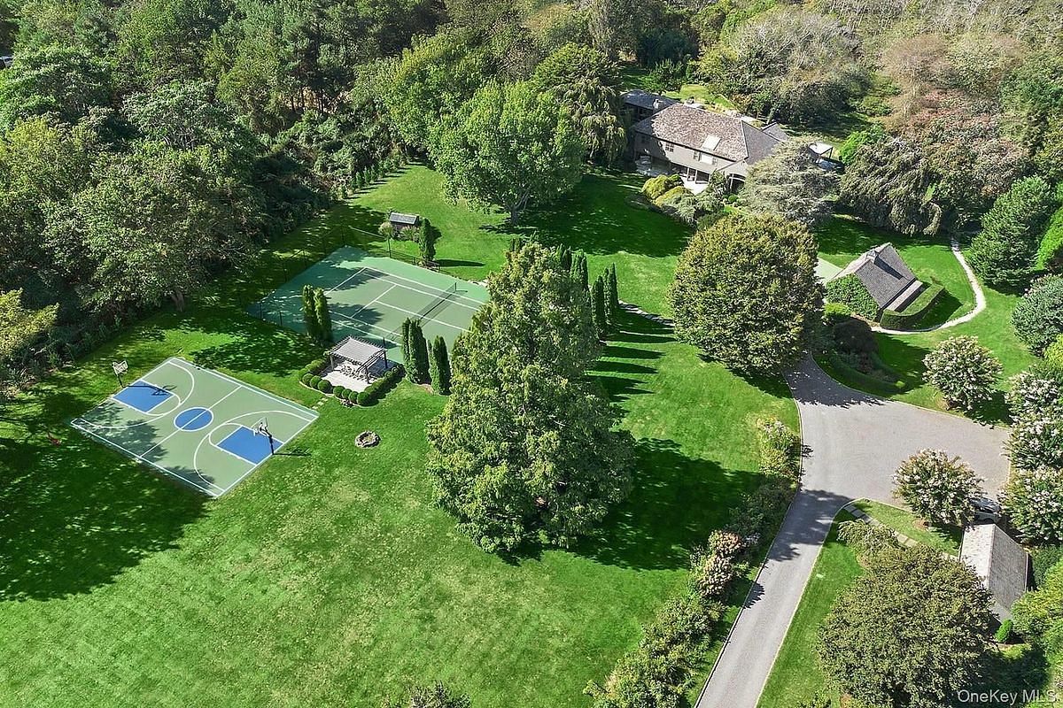 This South of the Highway estate has everything in place for a luxurious and private Hamptons escape. Secluded at the end of a long flag lot drive and set on an expansive 4.6-acre parcel, the property unfolds like your own personal resort. Mature, manicured plantings create natural privacy and a sense of timeless beauty, surrounding a full basketball court, a separate tennis court, and curated outdoor living areas designed for recreation, relaxation, and elegant entertaining. A detached 3-car garage with a turnaround drive offers ample parking for guests, while the garden-lined arrival leads to the traditional home. A welcoming covered front porch leads into bright interiors, where tall ceilings and a stunning curved staircase. The home's formal dining room features rich hardwood floors, ideal for gathering over memorable meals. Just beyond, the great room serves as the central gathering space, with a curated view of the estate's most striking specimen plantings framed by near floor-to-ceiling windows. This generous space includes a built-in bar for effortless entertaining and a wood-burning fireplace for added warmth and ambiance. The eat-in kitchen is designed for both functionality and elevated daily living, outfitted with premium appliances, custom cabinetry, and generous counter space. The kitchen flows seamlessly into a sunlit dining area, perfect for informal meals and morning coffee with views of the lush rear grounds. A first-floor primary suite offers a private retreat, complete with a walkout sitting room that opens directly to the poolside patio. Outside, the patio is a true extension of the living space, perfectly scaled for Hamptons summer living. A covered pergola dining area invites al fresco gatherings, while the freeform pool, with its custom attached spa, is bordered by stonework and garden beds. A stylish pool house with large sliding glass doors provides a secondary indoor-outdoor venue for leisure or entertaining. Upstairs, an additional living room lounge is bathed in natural light beneath skylights. Three well-appointed ensuite bedrooms provide comfort and privacy for loved ones and weekend guests. The exterior grounds are a masterclass in Hamptons landscape design, offering a variety of cultivated vignettes for quiet conversation, garden walks, and athletic pursuits. The full-court basketball court and tennis court are thoughtfully positioned and separated by a pergola viewing pavilion-perfect for spectators or shaded rest between matches. Located in a premier South of the Highway setting, this estate offers proximity to world-class ocean beaches, renowned farmstands, and the charm of nearby Villages. A private compound with resort-like amenities and a layout designed for elevated indoor-outdoor living, this offering captures the essence of the Hamptons lifestyle.