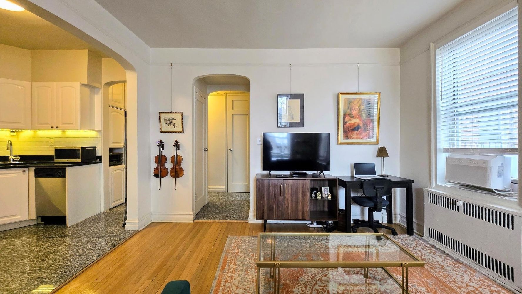 The apartment features an elegantly designed custom kitchen, complete with high-end stainless steel appliances, sleek cabinetry, and premium finishes. The beautifully renovated bathroom exudes sophistication with modern fixtures and tasteful design.
