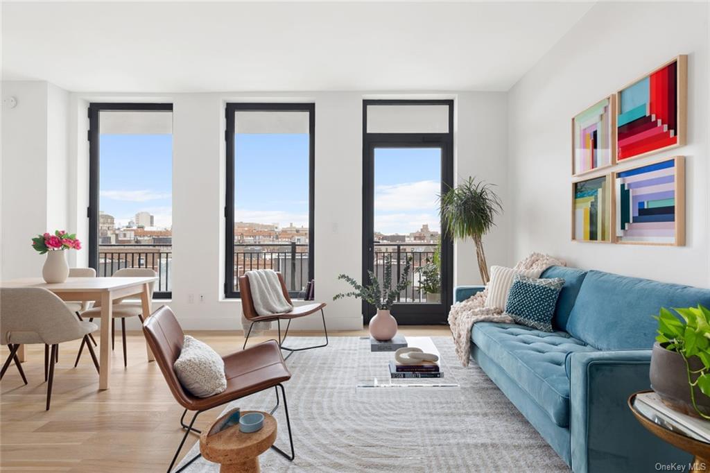 Immediate Occupancy | Crown Heights First full-service Condominium. Views of Prospect Park, Botanic Gardens and Manhattan from this gorgeous 934 sqft home. Sit on your beautiful 120 sqft balcony while overlooking the vast greenery of the park. This 2 bedroom, 2 bath home is well appointed with an L-shaped kitchen which leaves plenty of space for cooking and entertaining with a beautiful muted gray color palette. Floor-to-ceiling windows in every room of this bright and cheery residence bring the sunlight in. The extra-large primary bedroom has an ensuite bathroom and walk-in closets. The second bedroom is perfect as a home office, guest room or kids bedroom. 111 Montgomery is the new standard for design in balance. Soothing palettes, natural materials, and a focus on bringing botanical elements into every aspect of the interiors and common areas. Residences feature 5' white oak floors, honed quartz sleek concrete countertops, an all-Bosch appliance package and Palm-Springs inspired baths with floor to ceiling stacked tiles and elegant matte black hardware. Poised at the nexus of two legendary destinations: Prospect Park and the Brooklyn Botanic Garden, 111 Montgomery is a brand-new condominium with amenities never before seen in Crown Heights. Communal spaces abound, including a sumptuous, sunny co-working space and resident's lounge, community garden, BBQ / terrace dining area, fully equipped fitness center featuring Peloton bikes, an inventive wilderness themed children's playroom with Montessori climbing structure and spectacular landscaped roof terrace crowned by Brooklyn and Manhattan skyline views. Storage and bicycle storage are also available in the building. Manhattan is less than 20 minutes away (2,3,4 and 5 express trains), but there are endless reasons to stay local. Sophisticated cocktail lounges, Michelin recommended restaurants, the Brooklyn Museum, Prospect Park and the summer bandshell concerts, Grand Army Plaza Greenmarket- and so much more. Come discover, come play, come explore! All 111 Montgomery owners receive a complimentary one-year membership to their new neighbor, the Brooklyn Botanic Garden. The complete offering terms are available in an offering plan from sponsor. File No. CD18-0265. Sponsor: 109 Montgomery Owner LLC, 2329 Nostrand Avenue 3rd Floor, Brooklyn, NY 11210. Equal Housing Opportunity. Plans and dimensions may contain variations from floor to floor. Square Footage exceeds the usable floor area. The unit layout, square footage, and dimensions are approximate and subject to normal construction variances and tolerances. Sponsor reserves the right to make changes in accordance with the Offering Plan. The artist's representations of interior decorations, finishes, appliances, and furnishings are provided for illustrative purposes only and do not constitute a representation of any aspect of the final product.
