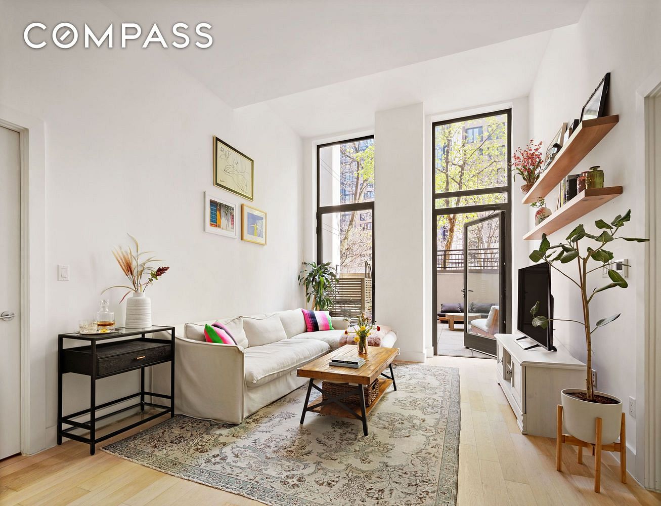 Enter this lovely home and be wowed by the soaring 13 ceiling height. Thoughtfully laid out, the open kitchen and living room extend outward towards floor to ceiling windows and doors. Accessed directly from both the living room and primary bedroom, an expansive 466 sq ft landscaped private outdoor patio is perfect for dining, gardening, entertaining and simply relaxing year round. The primary is large and quiet with an en-suite bathroom. This room is complete with a well designed closet and electric remote shades for convenience. The second bedroom is also large, with a huge custom outfitted closet and custom remote shades. The 2nd bathroom of the home has a soaking tub and the sweetest wallpaper to boot.