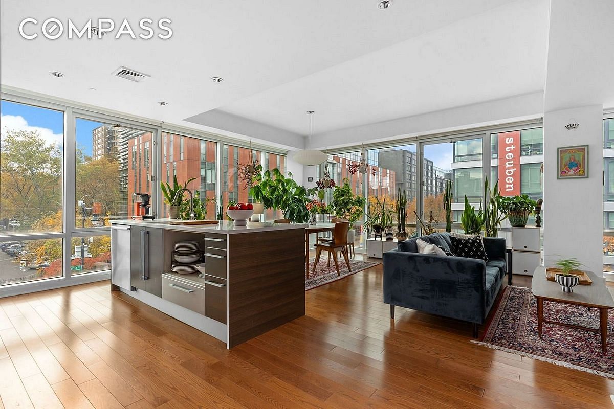 This modern and stylish corner apartment is south and west facing with an open floorplan living area, and walls of floor-to-ceiling double-paned windows which flood the space with natural light throughout the day.This corner configuration is by far the best layout in the building, lending the space an airy and expansive flow.