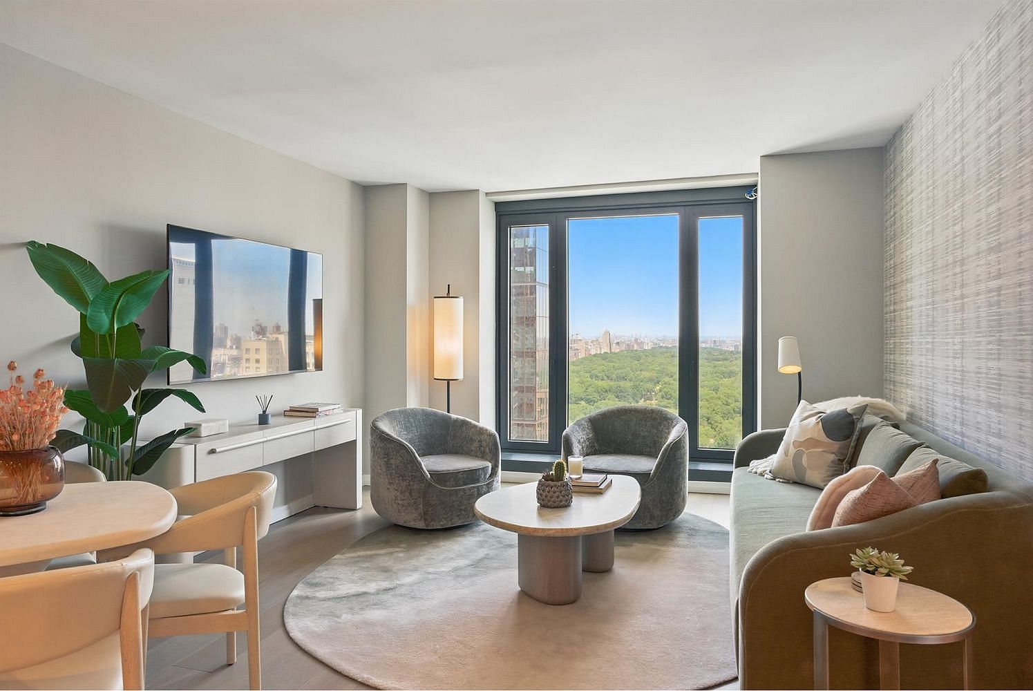 This light-filled, 707 square foot, one-bedroom, one-bathroom residence designed by Thomas Juul- Hansen, features an open-living concept with floor-to-ceiling windows showcasing extraordinary Central Park and Manhattan skyline views.