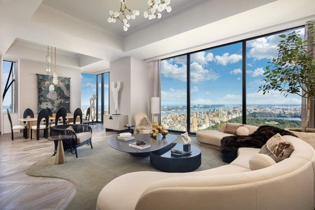 The formal Entry Gallery is finished with white macauba stone floors and offers a dramatic North to South view which opens into the sumptuous Great Room. This incredible space is highlighted by 14-foot ceilings and floor-to-ceiling windows which showcase unrivaled, perfectly centered views over Central Park.