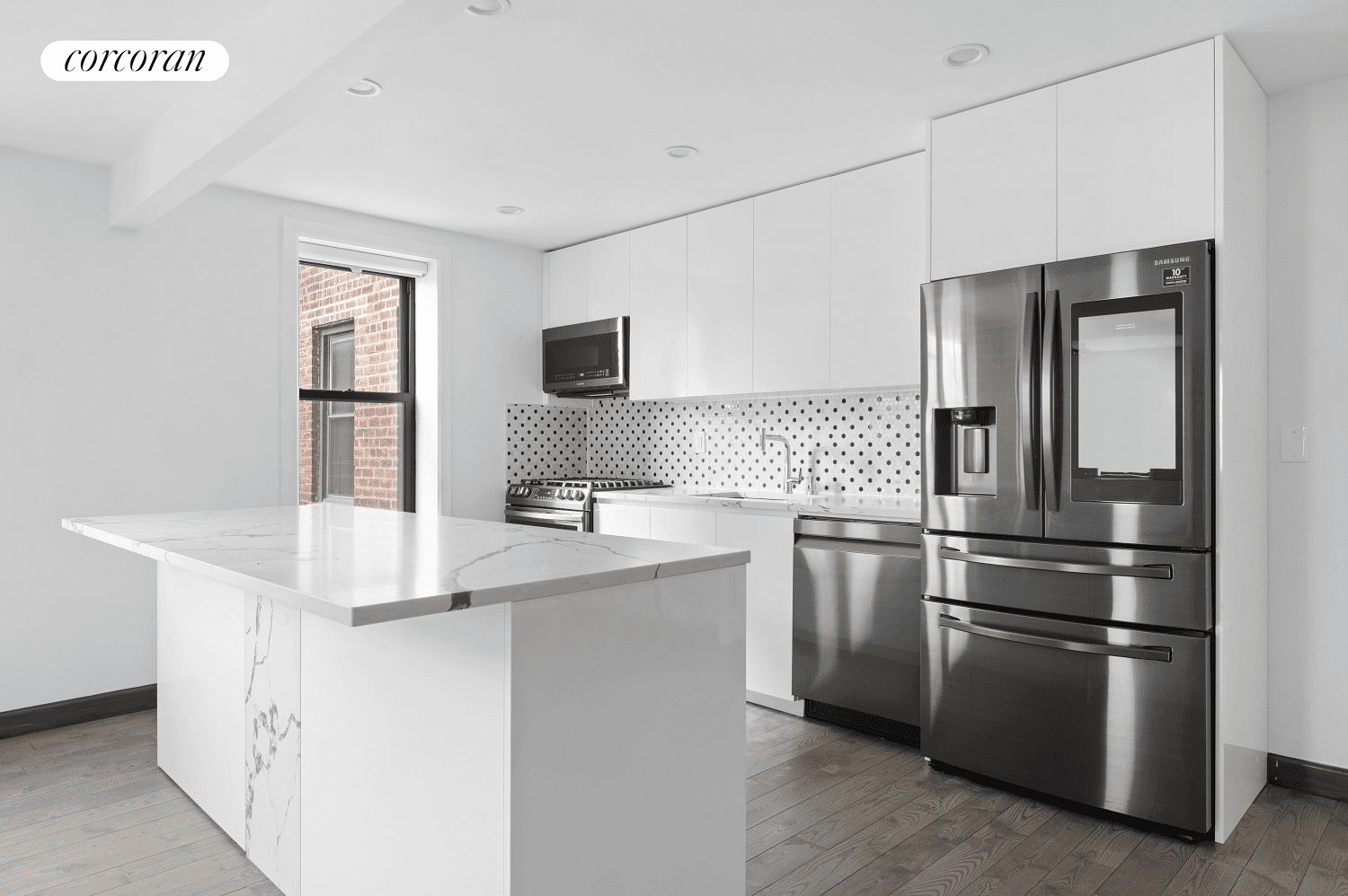Spanning 1500 square feet, the apartment is the result of combining two units into a comfortable 3 bed, 2 bath along with a spacious living area. The high-end renovation is evident throughout, beginning with the Italian kitchen from Copatlife, which boasts sleek cabinetry and quartz countertops. The open kitchen design facilitates effortless entertaining and everyday living. Located on a corner of the building with two exposures, the great room has 5 windows, insulated ceilings and recessed lighting.