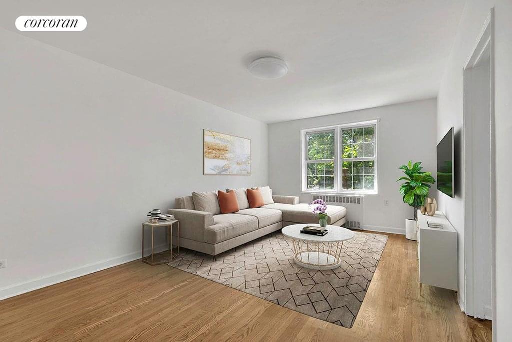 Larger than most new-development 1BDs, this gem of an apartment is overlooking a beautiful garden located in the rear of this quiet building. Enter the apartment through a foyer with a cleverly designed pantry/closet system into a well-planned kitchen boasting an oversized counter that may be used for dining and/or a work-from-home desk. The generous, open-concept living space has two west-facing windows with a lush view of treetops and plenty of room for living and entertaining. Just outside the recently renovated windowed bathroom, there is a very large walk-in closet in addition to a built-in cabinet with drawers and shelves. The unit has 8'8' ceilings and newly-refinished hardwood floors throughout.