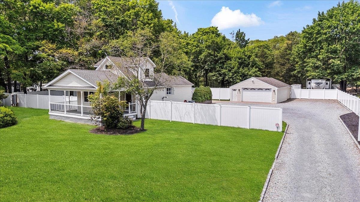 Discover this charming 3 bedroom Cape Cod, beautifully renovated and set on 1.26 acres of serene privacy. This home features a spacious living area, a basement with a separate outside entrance that offers potential for a mother/daughter setup with proper permits and a huge detached garage, perfect for vehicles or storage. Enjoy the comfort of a pellet stove that efficiently heats the entire house. Located just minutes from the LIRR train station and Sunrise Highway, commuting is a breeze and you benefit from low property taxes. With endless possibilities, this is a fantastic opportunity not to be missed!