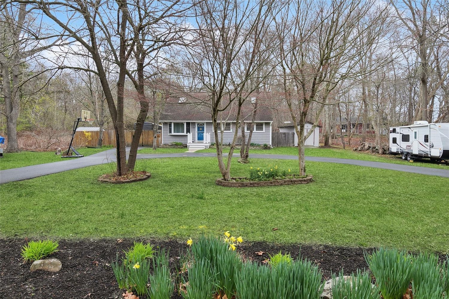 The sprawling, private .91 acre property adjoins Suffolk County Pine Trail Nature Preserve in addition to undeveloped NYS land. Great opportunities exist for hiking or horseback riding. The front yard includes a circular driveway and ample pavement for boat, trailer, etc. Sidewalks along front of house! Beautiful greenery and woods offer a wealth of possibilities for relaxation and recreation. Additionally, this remarkable home features a full basement with utilities, office, bilco doors, and ample storage space. This property truly has it all!