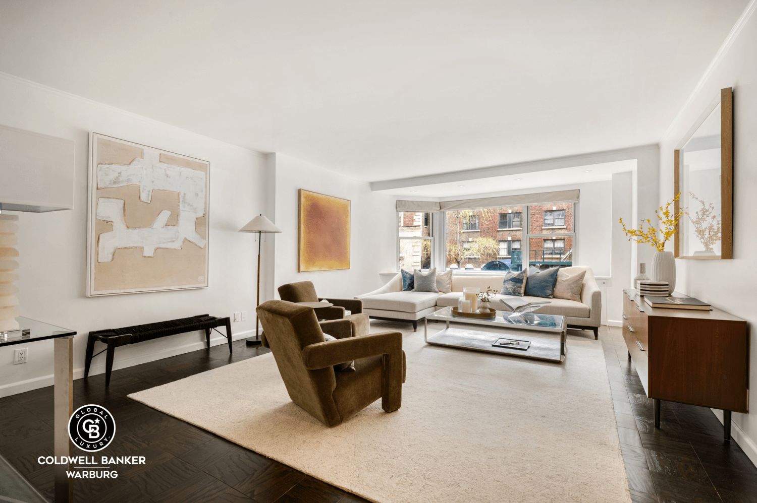 Enter through a welcoming foyer that immediately conveys scale and elegance. Straight ahead lies a bright, generously proportioned living room that can accommodate a variety of layouts to meet your specific entertaining needs. The adjacent formal dining room, framed by glass-paned pocket doors, comfortably hosts large gatherings, with ample room for a large table, buffet and console. Both rooms enjoy an uninterrupted northern exposure across leafy 72nd Street, delivering abundant natural light and a quintessential Upper East Side streetscape.