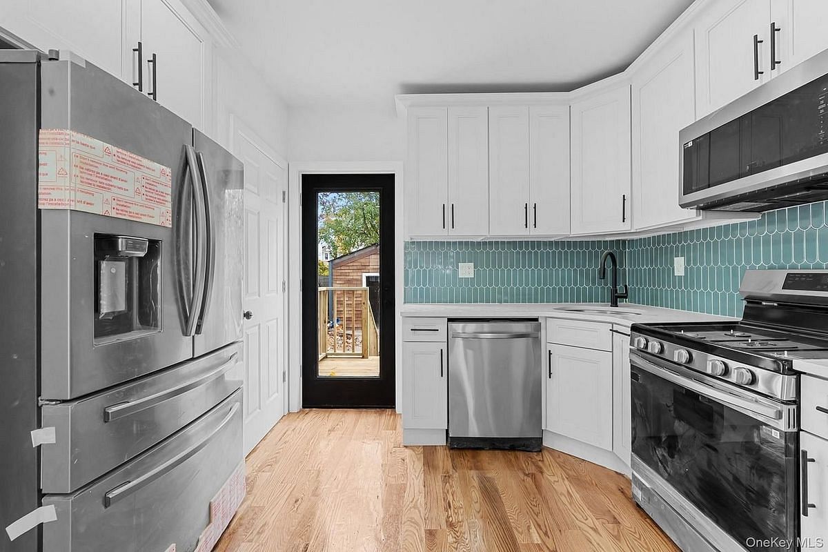 The first floor features an expansive sun drenched, modern, open concept living/dining area which provides great space for entertaining. The beautiful chefs granite kitchen is tucked away towards the rear of the property. Kitchen Features floor to ceiling custom cabinetry, adorned with a full fleet of stainless steel appliances, and leads out into lush rear yard. 1/2 bath on first floor for your guest.