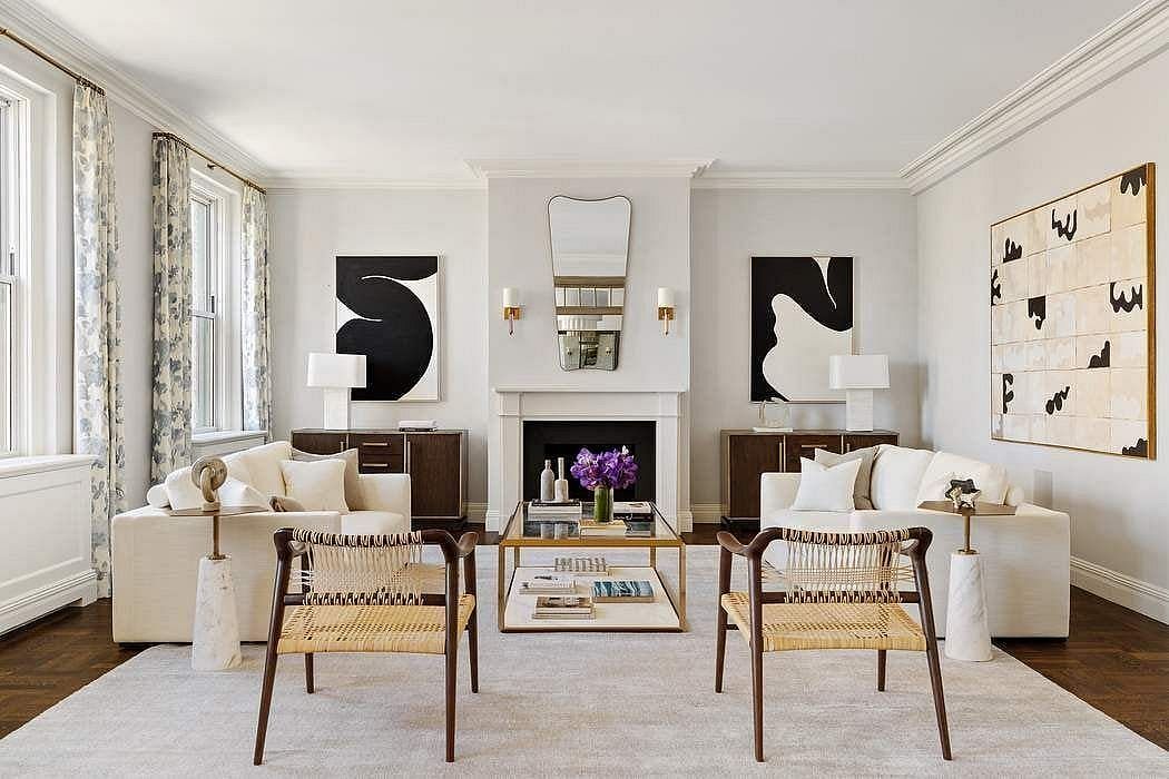 A semi-private elevator landing enters into an expansive gallery that highlights the apartments gracious room proportions and captivating ceiling heights. The oversized living room faces west and has scale that allows for several seating areas. Three oversized windows overlooking Park Avenue allow for sunlight throughout the day. A set of pocket-doors leads to the adjacent formal dining room which has open exposures from two large, west-facing windows overlooking Park Avenue. The apartments suite of entertaining rooms is completed by a library located at the end of the gallery. The well-proportioned corner library has open southern and eastern exposures from three large windows. The gallery also has a well-placed powder room.